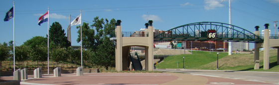 The Centennial Plaza, with the flags of the eight states of Route 66, and the Route 66 Skywalk, with its zigzag art deco style and familiar logo, were complete in July 2008 and dedicated on August 7, 2008.